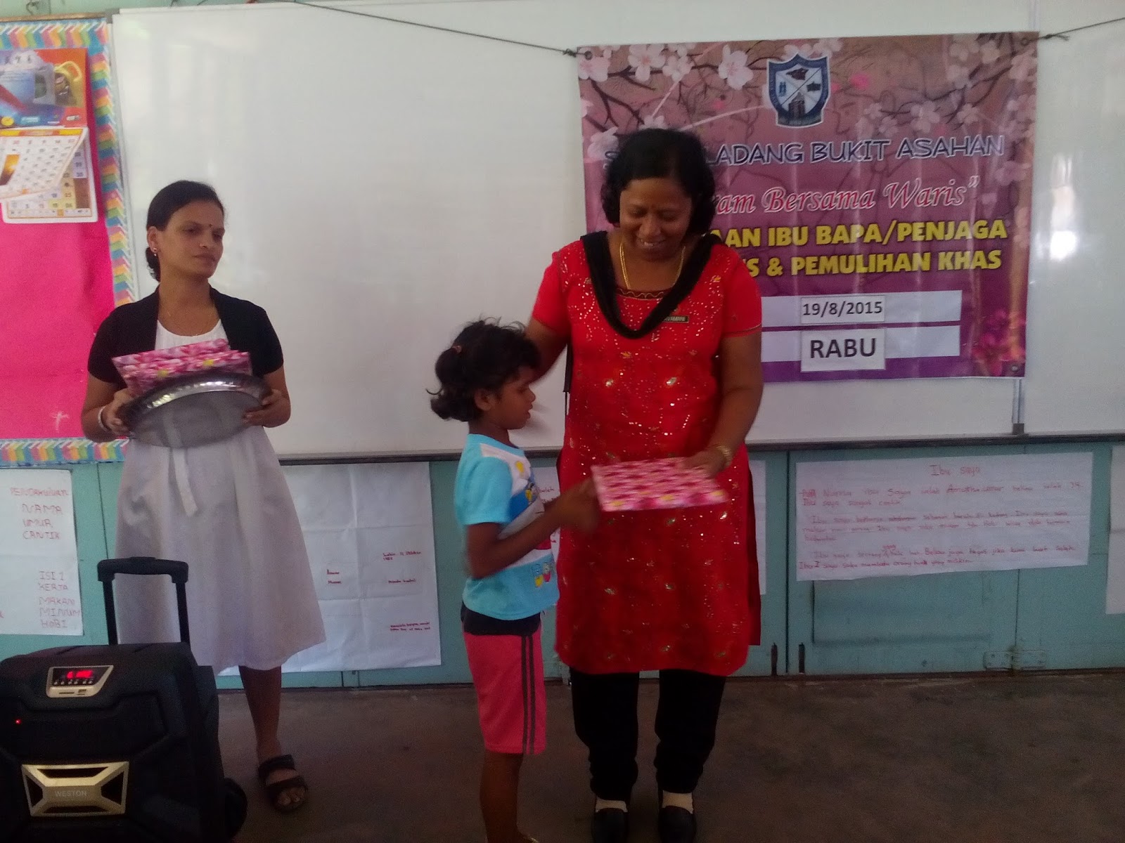 Penyampaian hadiah oleh Guru Besar kepada murid-murid permulihan
